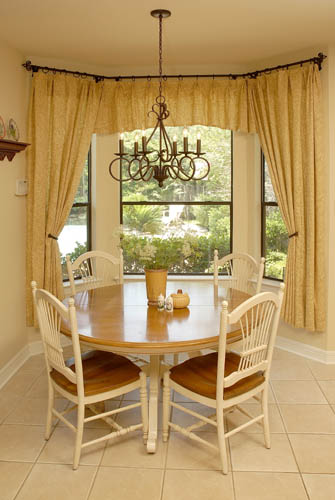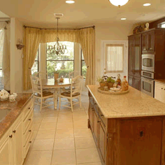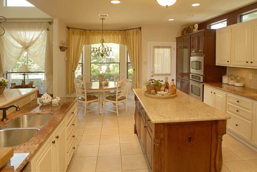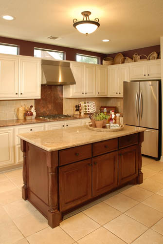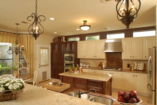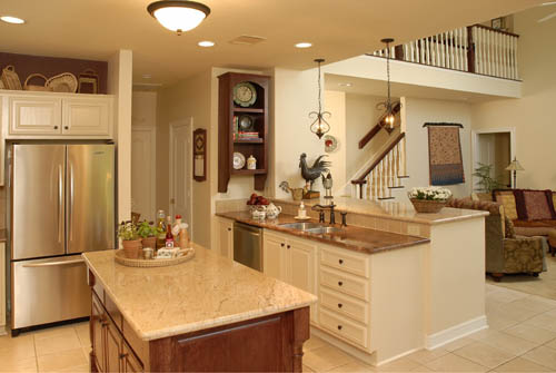 A "builder standard" kitchen gets an update blending the adjacent living room color palette and some French country style to create a unique, cohesive design.