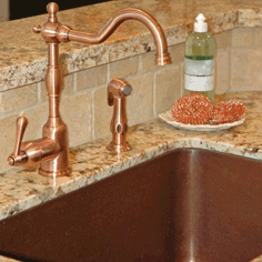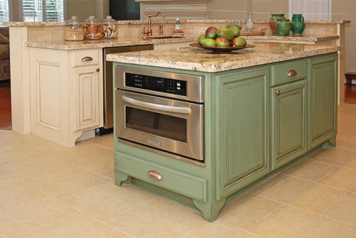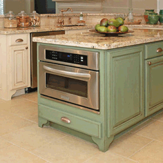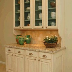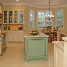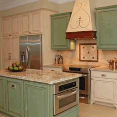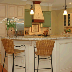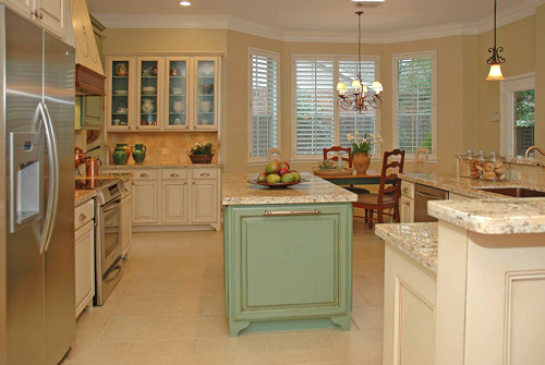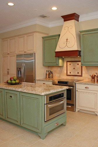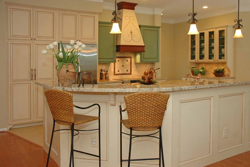 A light, airy French country kitchen was created with a creamy, soft color palette and copper accents. Relocating the ovens, cooktop, and the pantry provided a better use of the space and created the striking focal point of the new custom hood.